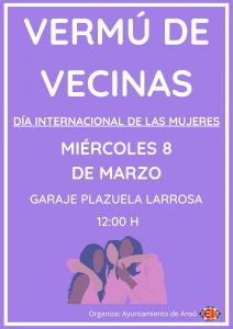 El día 8 a las 12:00 tendrá lugar el habitual vermú de vecinas con motivo del Día Internacional de la mujer. Se adjunta el cartel